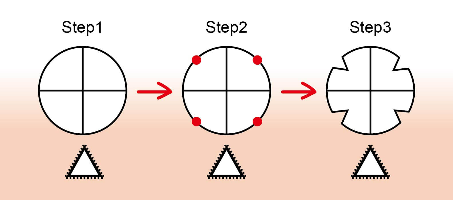 步驟1:使用正三角形銼刀頂角的位置在圓面上銼出一個十字線。